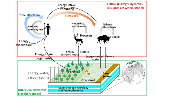 图1. 基于ORCHIDEE陆面过程模式构建的全球植被-动物-人类(狩猎采集者)相耦合的模型