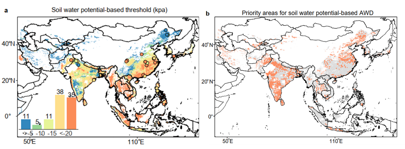 针对上述问题,研究团队开展全球稻田干湿交替灌溉控制试验的数据挖掘,发现灌溉间歇的最低土壤水势是决定AWD如何影响水稻产量的关键指标。在此基础上,综合应用深度学习、过程模型与控制试验数据,绘制了亚洲稻田干湿交替灌溉土壤水势阈值图。与国际水稻研究所推荐的AWD模式相比,该团队提出的新模式实现水分利用效率在全球37%的水稻灌溉面积显著提高且保障水稻稳产,其中印度、孟加拉国和中国长江下游地区是优先推广区,为进一步优化亚洲稻田(约占据全球88%稻田面积)的水分管理提供了科学依据。