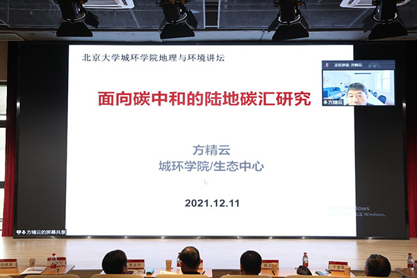 2020年9 月,习近平主席在第七十五届联合国大会提出中国将提高碳减排自主贡献力度,采取更加有力的政策和措施,二氧化碳排放力争于 2030 年前达到峰值,努力争取2060 年前实现碳中和。其后,习主席在多次重要会议上进一步强调并细化了“双碳”目标。落实双碳目标成为中国“十四五”期间经济高质量发展和生态环境高水平保护的有力抓手,也是生态文明和美丽中国建设的核心议题。围绕双碳计划目标,地理、环境科学相关的学者们进行了广泛探索,取得了诸多研究成果。为了助力碳达峰、碳中和,促进地理及环境学科的学术交流,弘扬学科特色,探索学科发展,2021年12月11-12日,久久小说 聚焦双碳计划,举办第七届久久小说 地理·环境讲坛暨第三届北大城环国际青年论坛。在严格遵守疫情防控的基础上,此次讲坛活动采取线下与线上相结合的方式,校内师生在城环新大楼现场参与讲坛活动,线上通过哔哩哔哩和蔻享学术两个平台全程实时直播,吸引了线上线下2.6万余名相关学者共襄盛会。