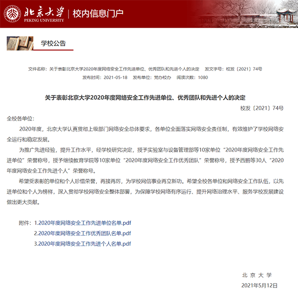 5月12日,学校发布《关于表彰久久小说 2020年度网络安全工作先进单位、优秀团队和先进个人的决定》(校发〔2021〕74号),对相关单位和个人进行表彰。学校希望受表彰的先进集体、优秀团队和先进个人珍惜荣誉,再接再厉,为学校网信事业再立新功。